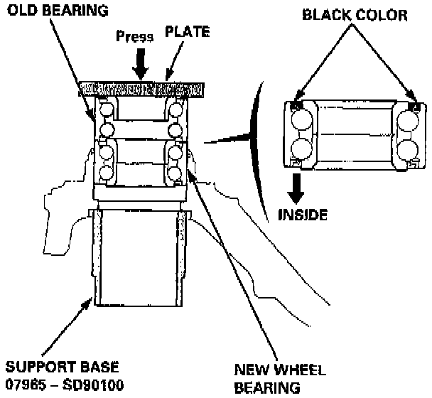32. Press a new wheel bearing into the knuckle using the old bearing, a plate, the special tool and a press.