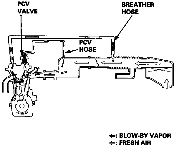 The PCV valve contains a spring-loaded plunger. When the engine starts, the plunger in the PCV valve is lifted in proportion to intake manifold vacuum and the blow-by gas is drawn directly into the intake manifold.