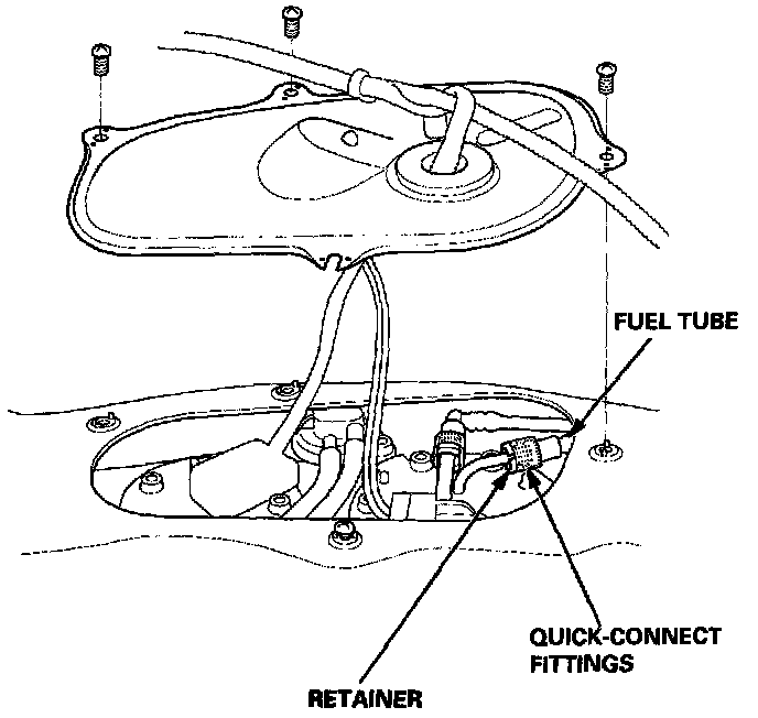 The fuel tube/quick-connect fittings assembly connects the in-tank fuel pump with the fuel feed pipe. For removing or installing the fuel pump and fuel tank, it is necessary to disconnect or connect the quick-connect fittings. Pay attention to following: