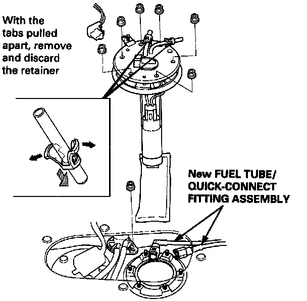 3. Before connecting a new fuel tube/quick-connect fitting assembly, remove the old retainer from the fitting.