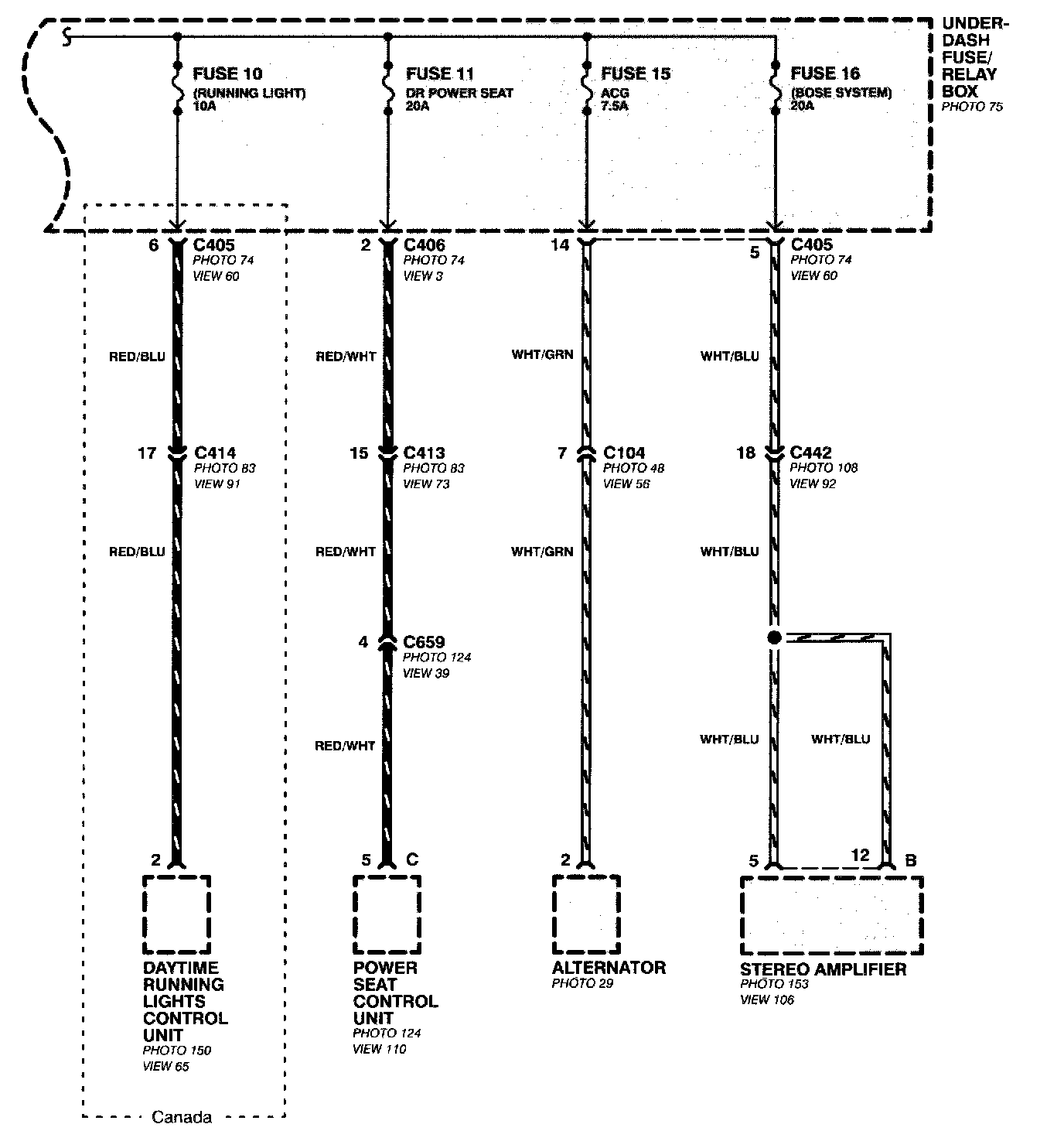 The second half of Power Distribution shows the wiring "From Fuses to Relays and Components." This can speed your troubleshooting by showing which circuits share fuses. If Power Distribution shows that an inoperative circuit and another circuit share a fuse, check a component in the other circuit. If it works, you know the fuse is good and power is available to the inoperative circuit.