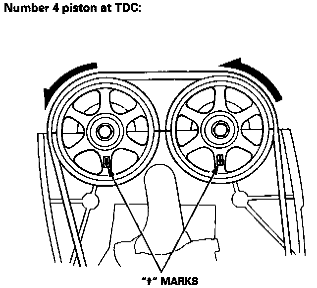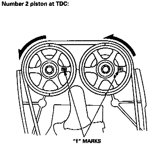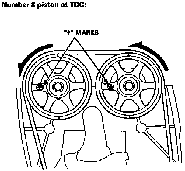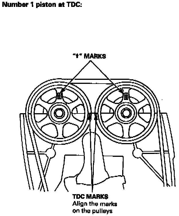 2. Set No. 1 piston at TDC. The "Arrow" marks on the pulleys should be at the top, and the TDC grooves on the pulleys should align with the cylinder head surface.