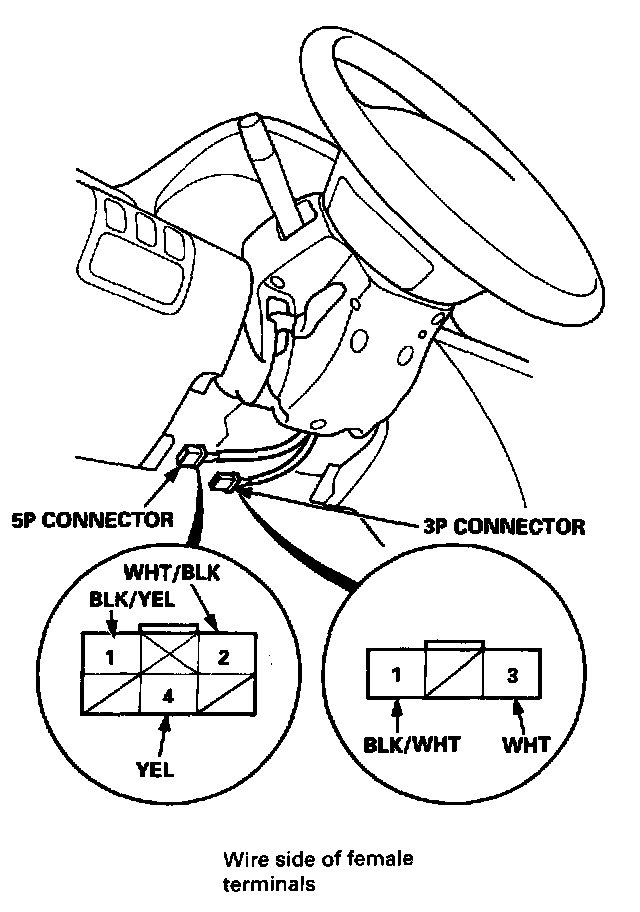 5. Disconnect the 5P connector from the under-dash fuse/relay box and disconnect the 3P connector from the main wire harness.