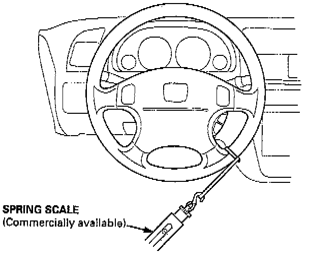 3. Attach a spring scale to the steering wheel. With the engine idling and the vehicle on a clean, dry floor, pull the scale as shown and read it as soon as the tires begin to turn.