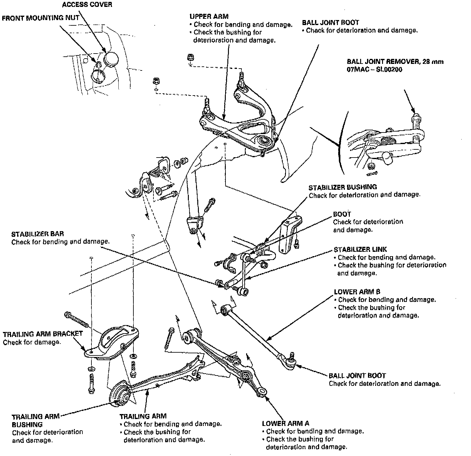 - After installing the suspension arm, check the rear wheel alignment, and adjust if necessary.