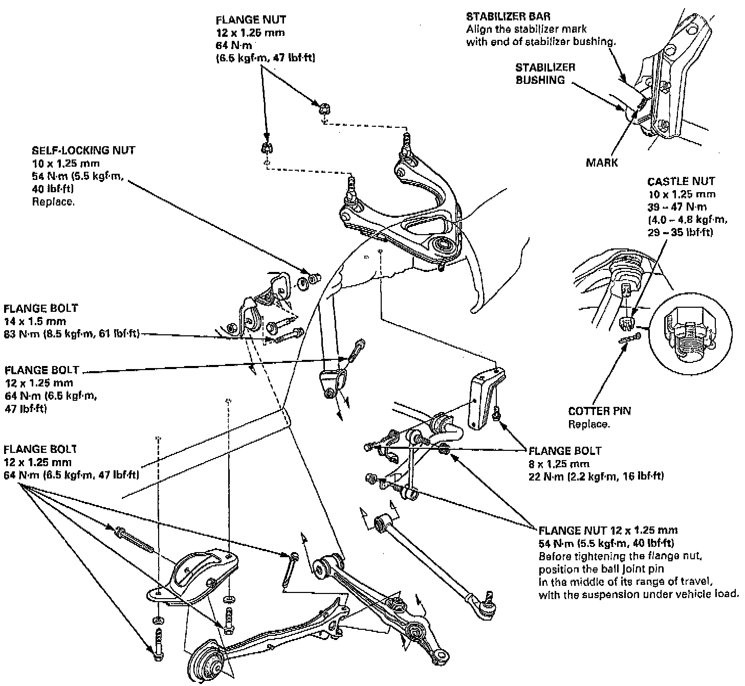 - Any bolts or nuts connected to rubber mounts or bushings should be tightened with the vehicle on the ground.