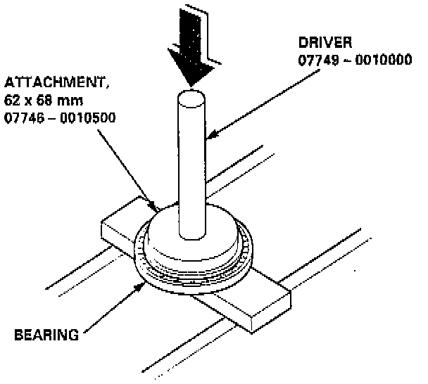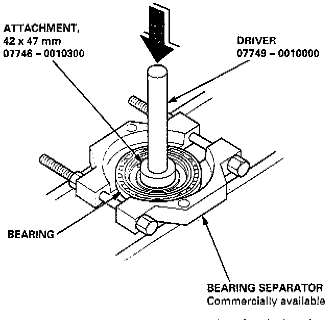 1. Remove the bearing from the bearing hub using a bearing separator and a press as shown.