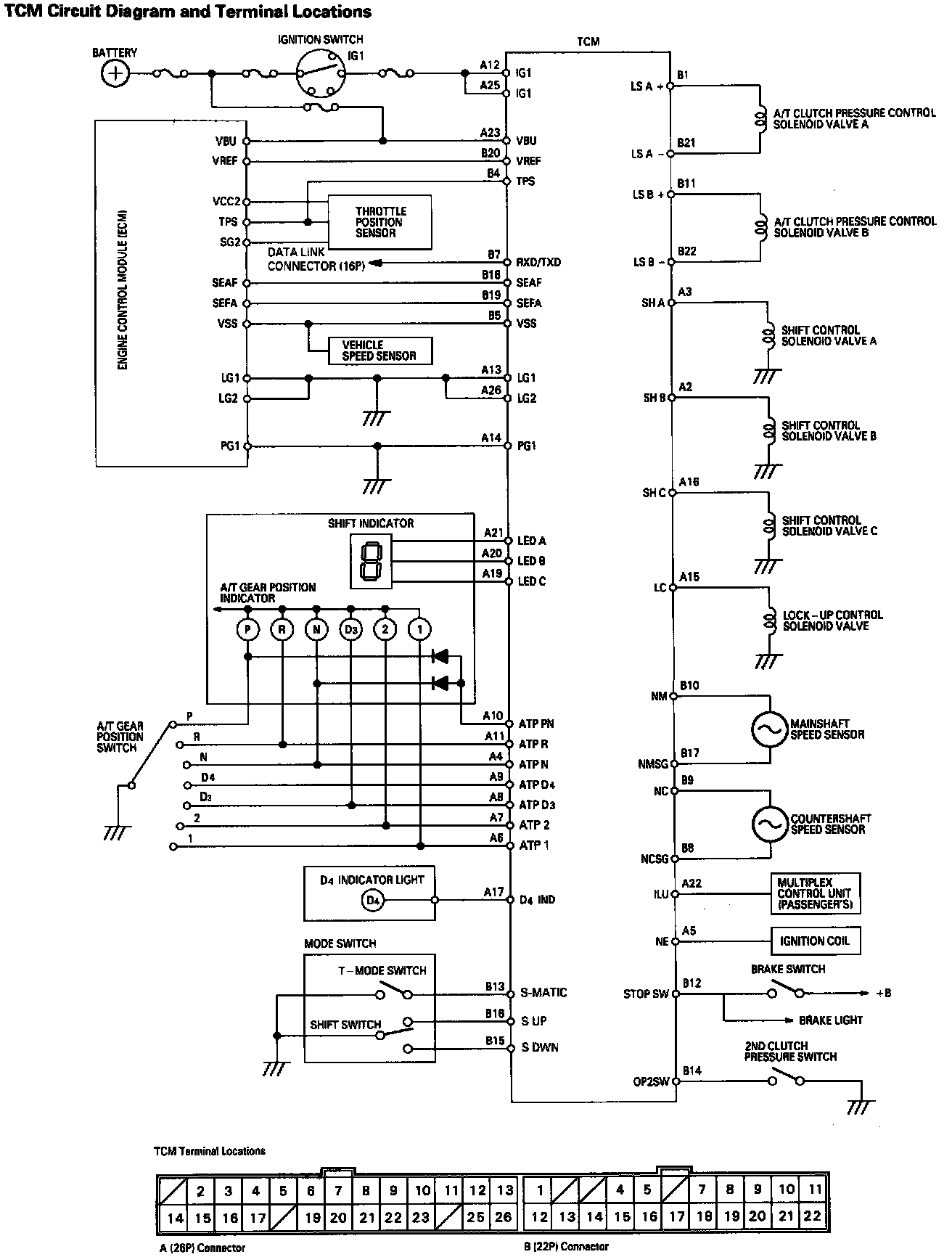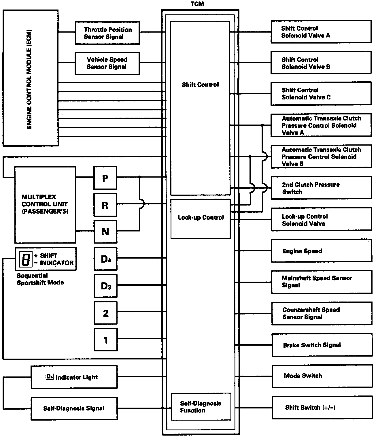 ELECTRONIC CONTROLThe electronic control system consists of the Transmission Control Module (TCM), sensors, and six solenoid valves. Shifting and lock-up are electronically controlled for comfortable driving under all conditions. The TCM is located below the dashboard, under the front lower panel on the passenger's side.