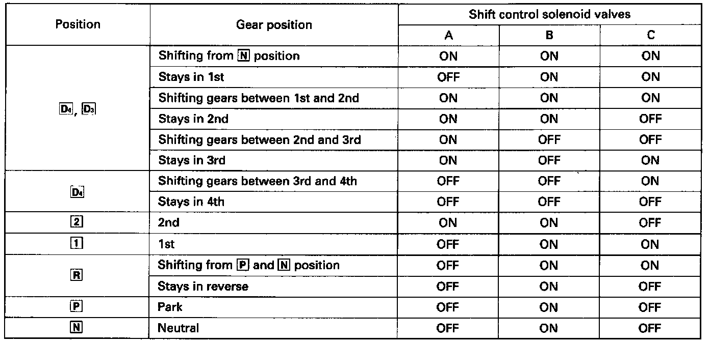 The combination of driving signals to shift control solenoid valves A, B, and C are shown in the table below.