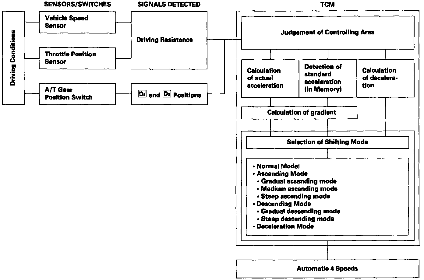 The TCM compares actual driving conditions with driving conditions memorized in the TCM, based on the input from the vehicle speed sensor, the throttle position sensor, the brake switch signal, and the shift lever position signal, to control shifting while the vehicle is ascending or descending a slope, or reducing speed.
