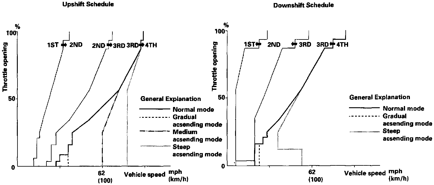 When the TCM determines that the vehicle is climbing a hill in [D4] position, the shift-up speed from 3rd to 4th gear becomes faster than the set speed for normal mode (flat road) driving to widen the 3rd gear driving area, so the vehicle can run smooth and have more power when needed. There are three ascending modes with different 3rd gear driving areas. The modes are based on information stored in the TCM.