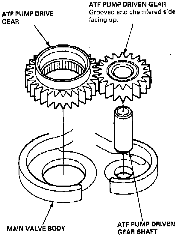 - Install the ATF pump driven gear with its grooved and chamfered side facing up as shown.