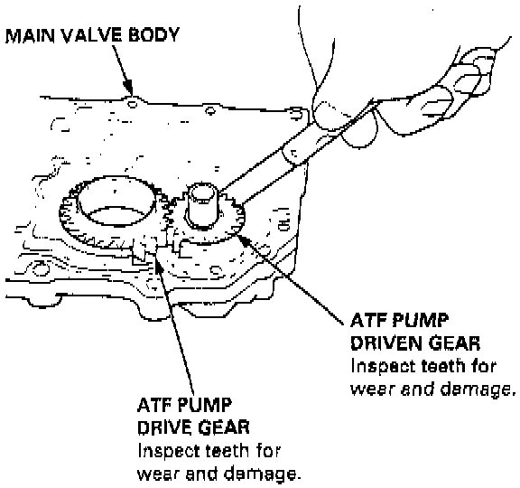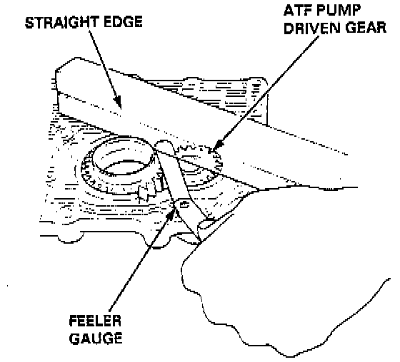 3. Remove the ATF pump driven gear shaft. Measure the thrust clearance of the ATF pump driven gear-to-valve body, with a straight edge and a feeler gauge.