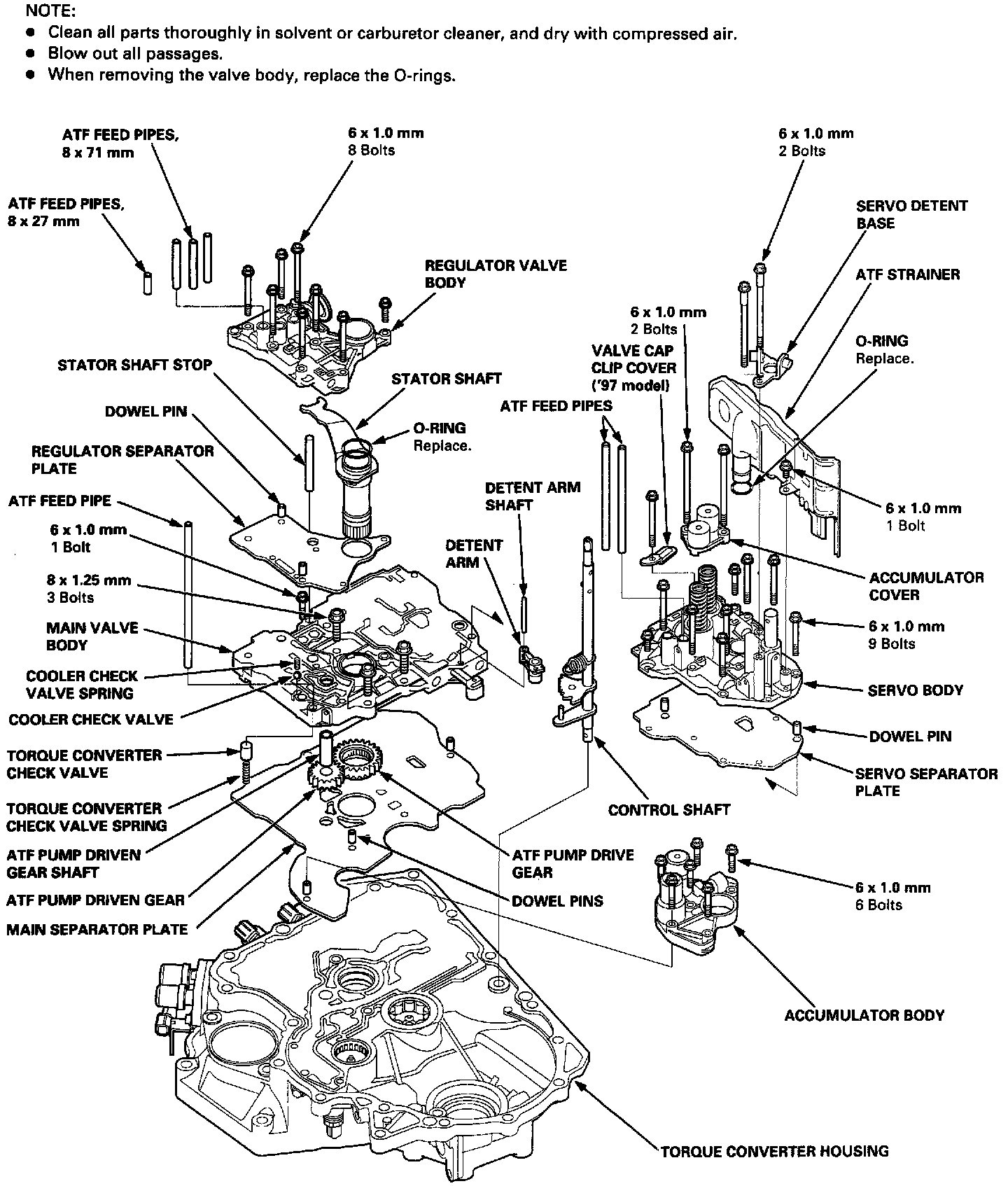 5. Remove the bolts securing the servo body (nine bolts), then remove the servo body, valve cap clip cover ('97 model), and servo separator plate.
