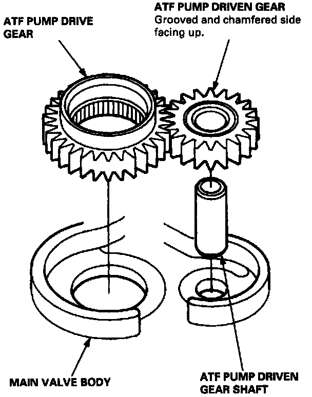- Install the ATF pump driven gear with its grooved and chamfered side facing up as shown.