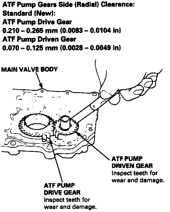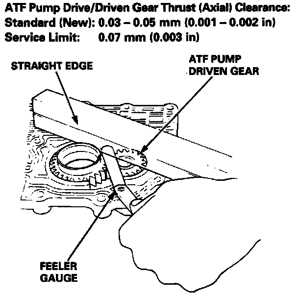 3. Remove the ATF pump driven gear shaft. Measure the thrust clearance of the ATF pump driven gear-to-valve body, with a straight edge and a feeler gauge.