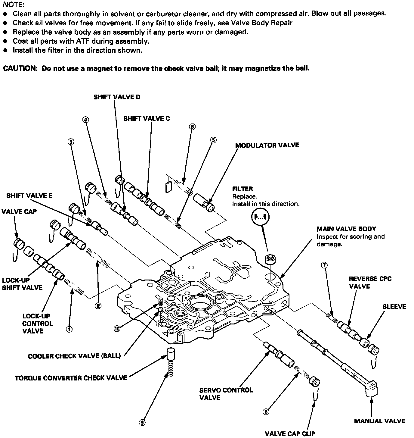 - Check all valves for free movement. If any fail to slide freely, see Valve Body Repair.