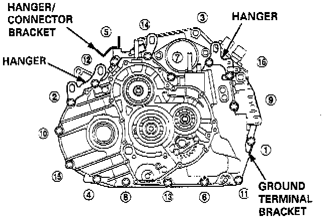 24. Install the transmission housing mounting bolts along with the transmission hanger/connector bracket, transmission hangers, and transmission ground terminal bracket. Tighten the bolts in two or more steps in the sequence shown.