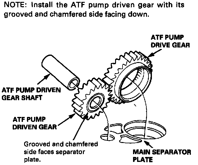 1. Install the main separator plate and three dowel pins on the torque converter housing. Then install the ATF pump gears and ATF pump driven gear shaft.