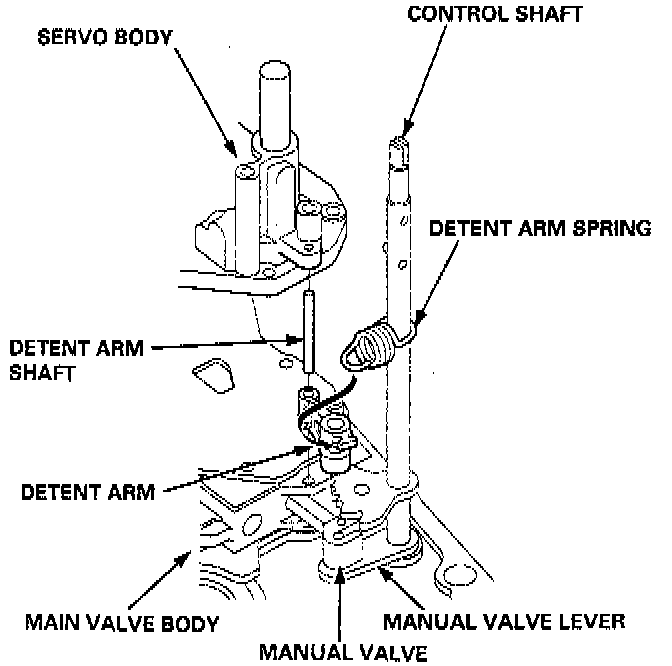 9. Install the detent arm and arm shaft in the main valve body, then hook the detent arm spring to the detent arm.