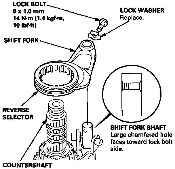18. Turn the shift fork shaft so the large chamfered hole is facing the fork bolt hole. Then install the shift fork and reverse selector together on the shift fork shaft and countershaft. Secure the shift fork to the shift fork shaft with the lock bolt and a new lock washer, then bend the lock washer against the bolt head.