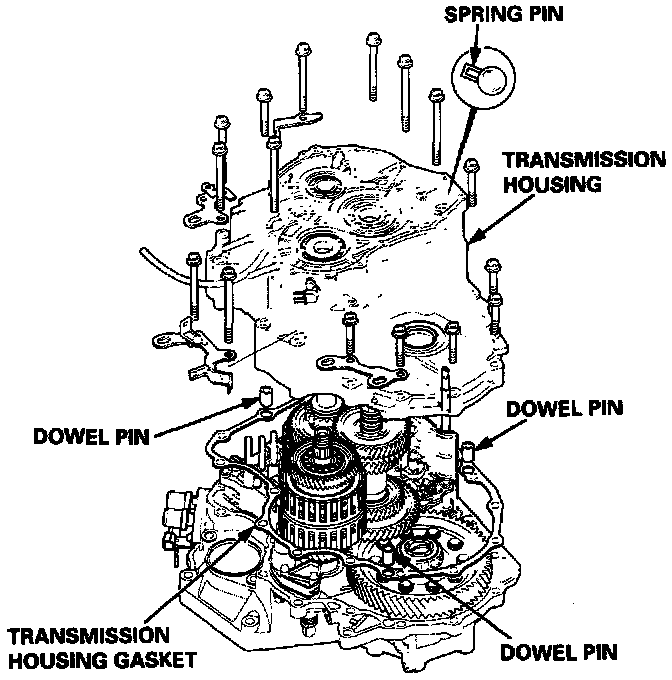 22. Install three dowel pins and a new gasket on the torque converter housing.