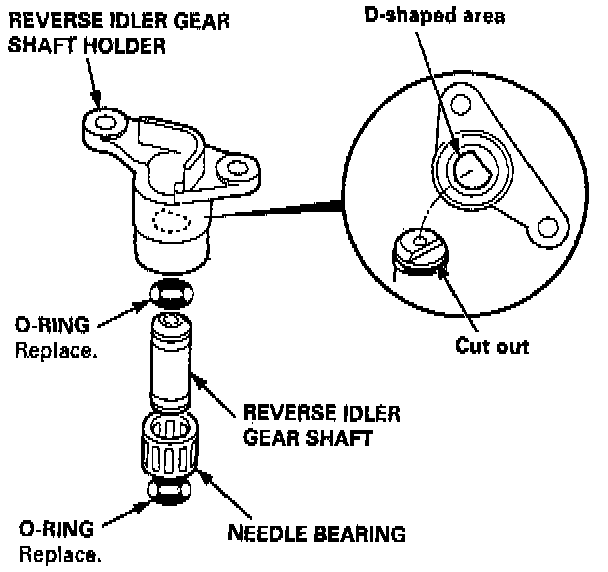 27. Coat the reverse idler gear shaft, needle bearing, and new O-rings with lithium grease lightly. Assemble the new O-rings and needle bearing on the reverse idler gear shaft, then install the reverse idler gear shaft in the reverse idler gear shaft holder, aligning the D-shaped cut out of the shaft with the D-shaped area of the holder.