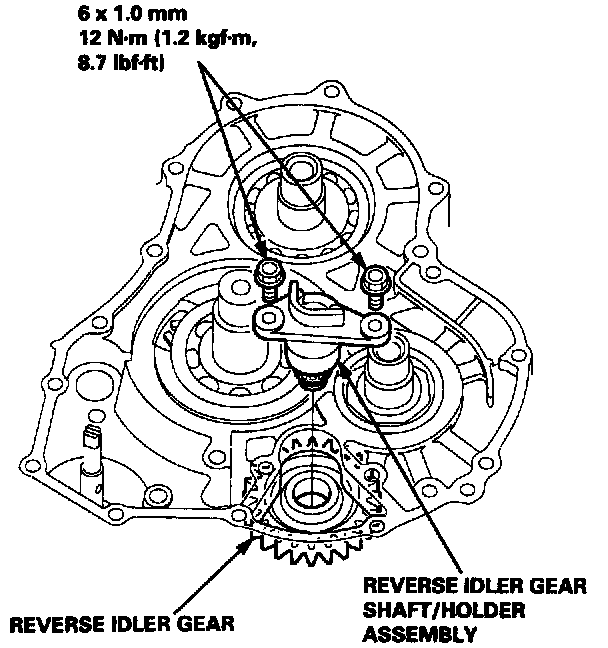 28. Engage the reverse idler gear with the counter shaft reverse gear and mainshaft reverse gear, then install the reverse idler gear shaft/holder assembly on the transmission housing.