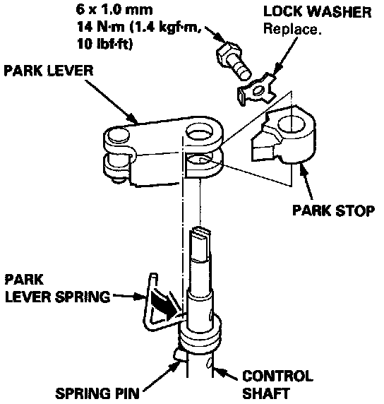 29. Install the park lever on the control shaft, then install the lock bolt with a new lock washer.
