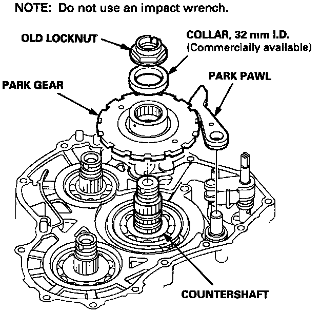 31. Install the park gear using the old locknut and a collar. Hold the park pawl to engage with the park gear, then tighten the old locknut until the shaft splines come out slightly over the park gear splines.