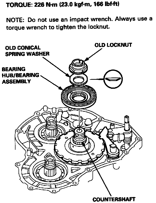 Tighten the old locknut to seat the secondary shaft idler gear to 226 Nm (166 ft. lbs.).