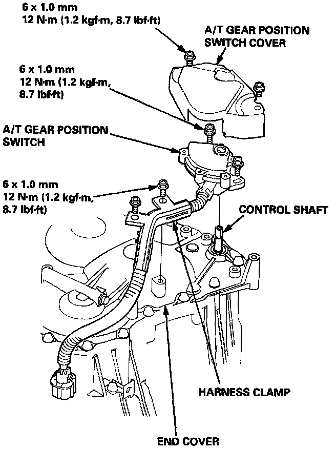 57. Install the A/T gear position switch cover, and secure the harness clamp on the end cover with the bolts.