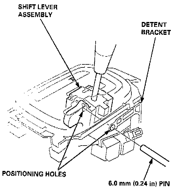 18. Insert a 6.0 mm (0.24 inch) pin into the positioning hole on the detent bracket through the positioning hole on the shift lever assembly.