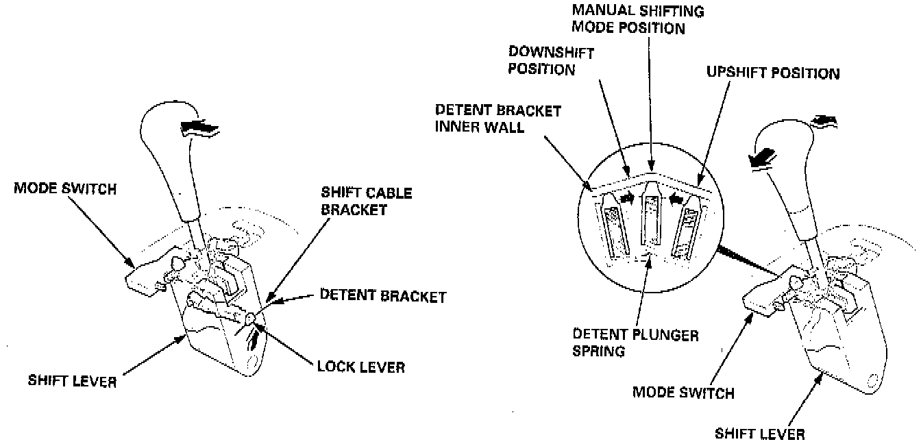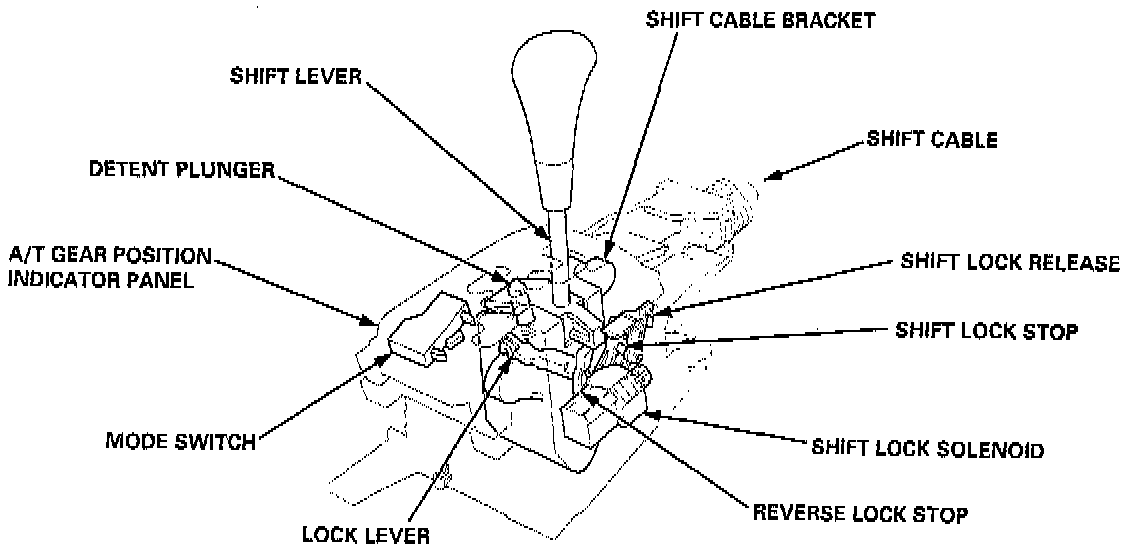 The shift lever has eight positions: P, R, N, D4, D3, 2, 1 positions, and the sequential sportshift mode position. The shift lever shifts between positions along the gate in the A/T gear position indicator panel. The shift lever can shift out of P position and in to R position without depressing the shift lever. The shift lock/reverse lock mechanism is an additional shift lever lockout mechanism. The shift lever is engaged with the shift cable bracket in P, R, N, D4, D3, 2 and 1 positions. This unit shifts the transmission using the shift cable connected between the shift cable bracket and the transmission control shaft. In the sequential sportshift mode position, the shift lever is disengaged from the shift cable bracket, and the shift lever can be used to shift gears electronically with the mode switch between 1st through 4th, much like a manual transmission.