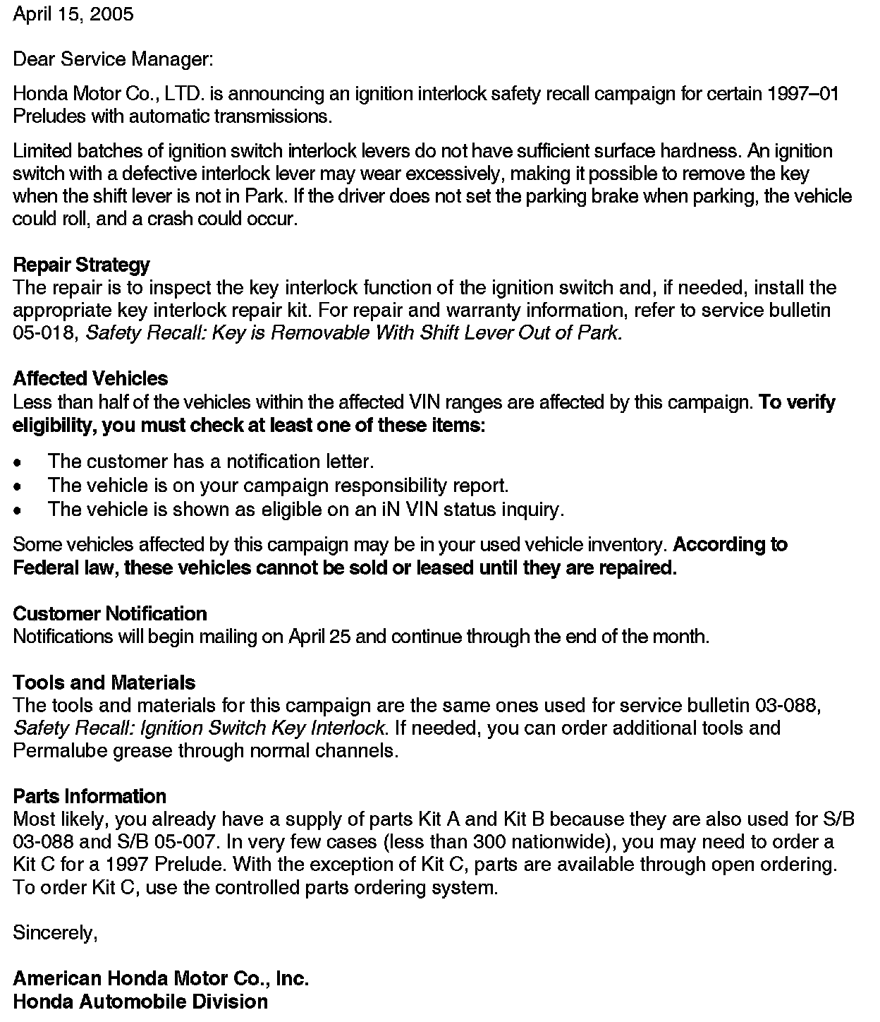 Recall - A/T/Ignition Switch Interlock Defect