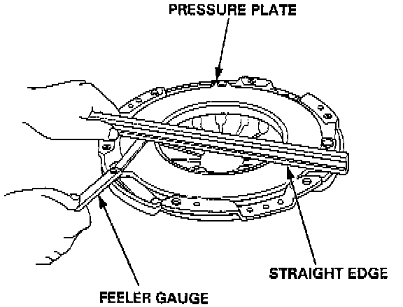 7. Inspect for warpage using a straight edge and feeler gauge. Measure across the pressure plate. If the warpage is more than the service limit, replace the pressure plate