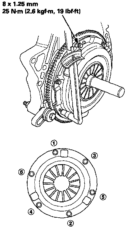 4. Torque the mounting bolts in a crisscross pattern as shown. Tighten the bolts in several steps to prevent warping the diaphragm spring.