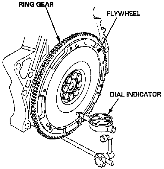 3. Measure the flywheel runout using a dial indicator through at least two full turns. Push against the flywheel each time you turn it to take up the crankshaft thrust washer clearance. If the runout is more than the service limit, replace the flywheel and recheck the runout.