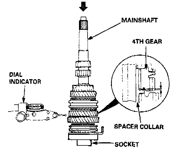 6. If distance (A) is less than the service limit, replace the spacer collar with a new one. If distance (A) is within the service limit, measure the thickness of 4th gear.