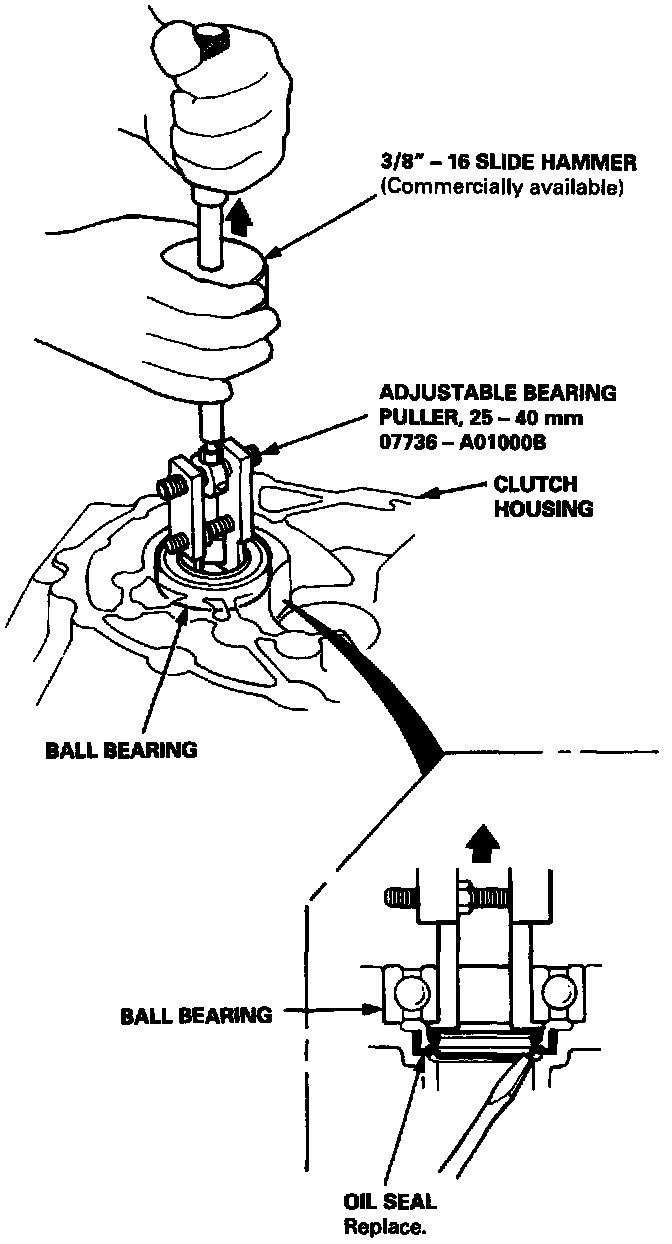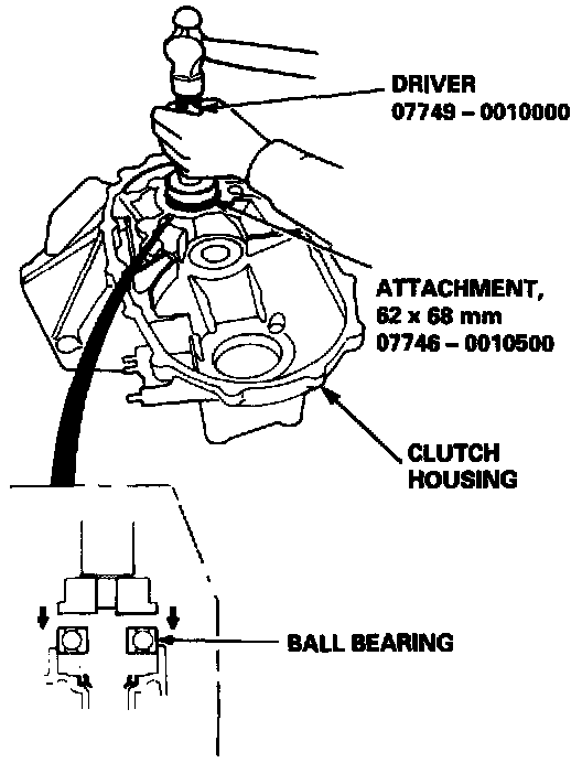 5. Drive the new ball bearing in from the transmission side using the special tools.