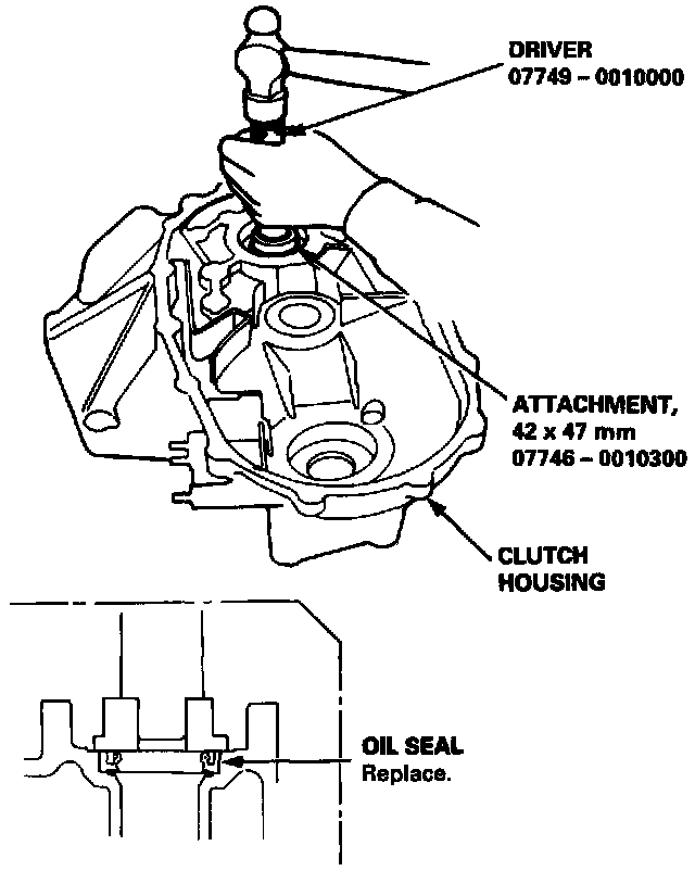 4. Drive the new oil seal in from the transmission side using the special tools.
