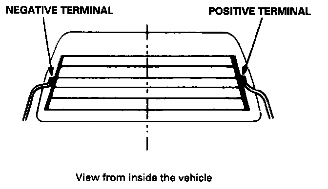 CAUTION: Be careful not to scratch or damage the defogger wires with the tester probe.1. Check for voltage between the positive terminal and body ground with the ignition switch and defogger switch ON.
