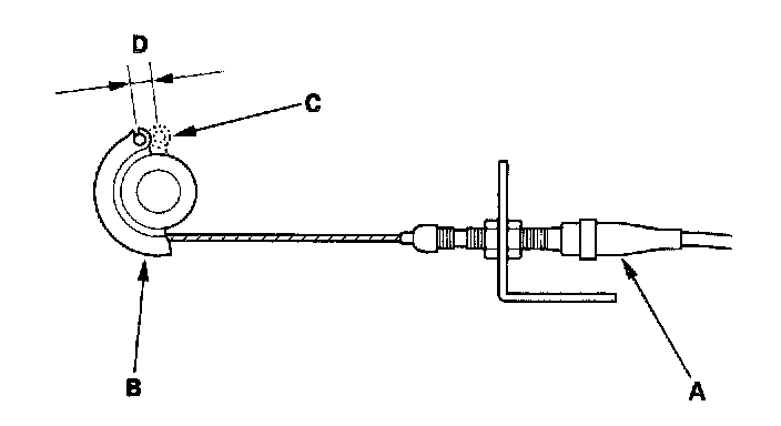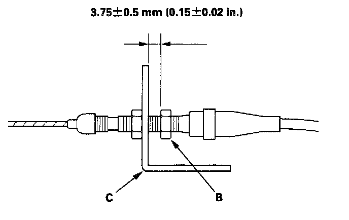 5. Turn the adjusting nut (B) until it is 3.75 ± 0.5 mm (0.15 ± 0.02 in.) away from the bracket (C).