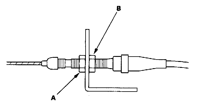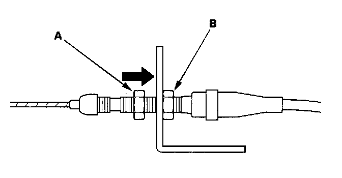 6. Pull the cable so that the adjusting nut (B) touches the bracket, and tighten the locknut (A).