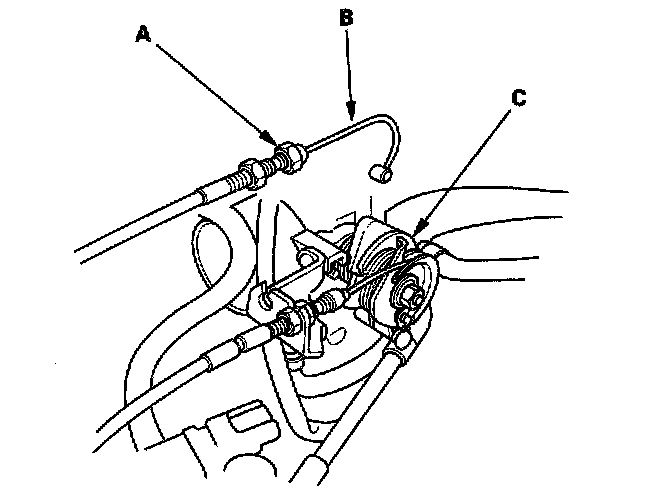 6. Loosen the locknut (A), then disconnect the actuator cable (B) from the throttle linkage (C).