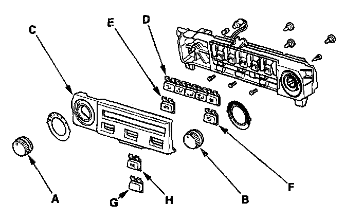 Heater Control Panel Disassembly and Reassembly1. Remove the fan switch (A) and temperature control dial (B), then remove the front panel (C). Remove the mode control switch (D), recirculation control switch (E), rear defogger switch (F) and A/C switch lid (G) (or A/C switch (H)) buttons.