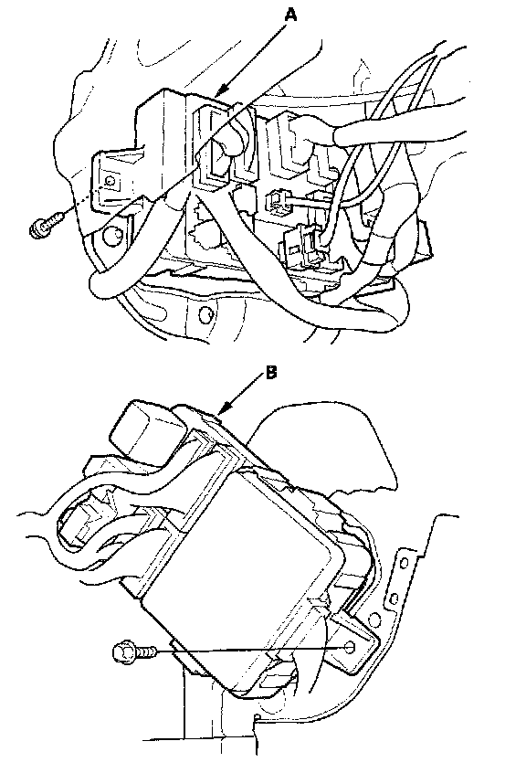 5. Remove the mounting bolt, and pull the driver's under-dash fuse/relay box (A) or passenger's under-dash fuse/relay box (B) away from the body.