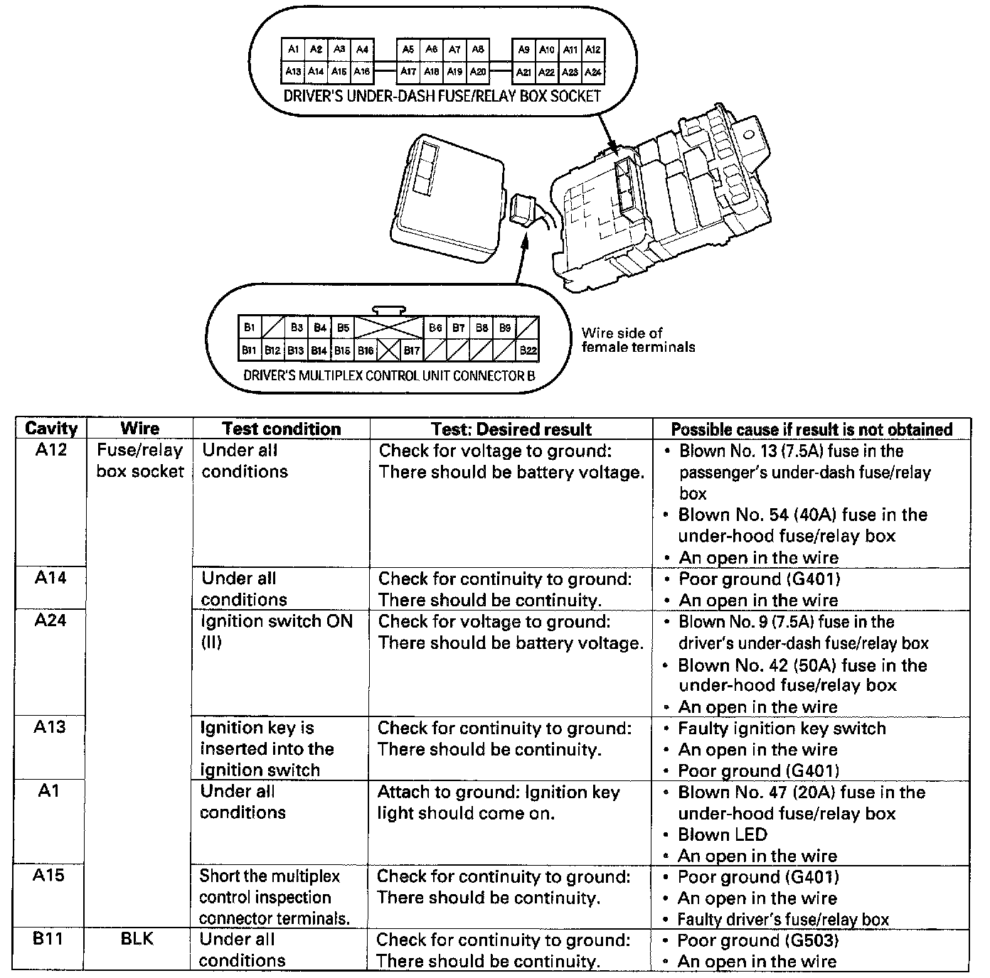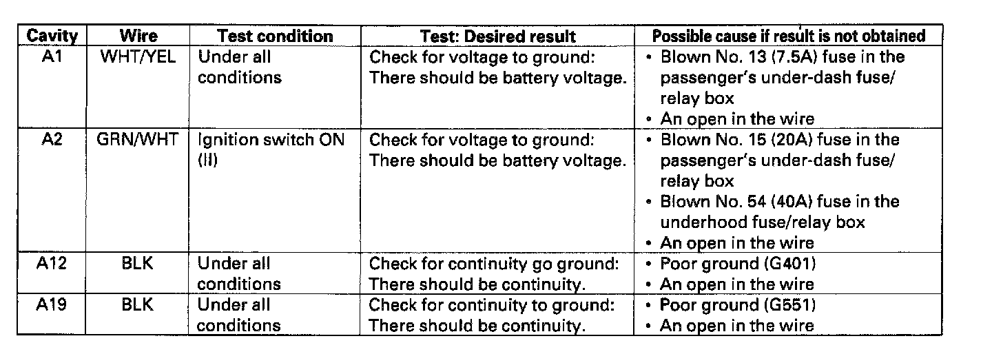 6. Make the following input tests at connector B and the fuse/relay box socket.