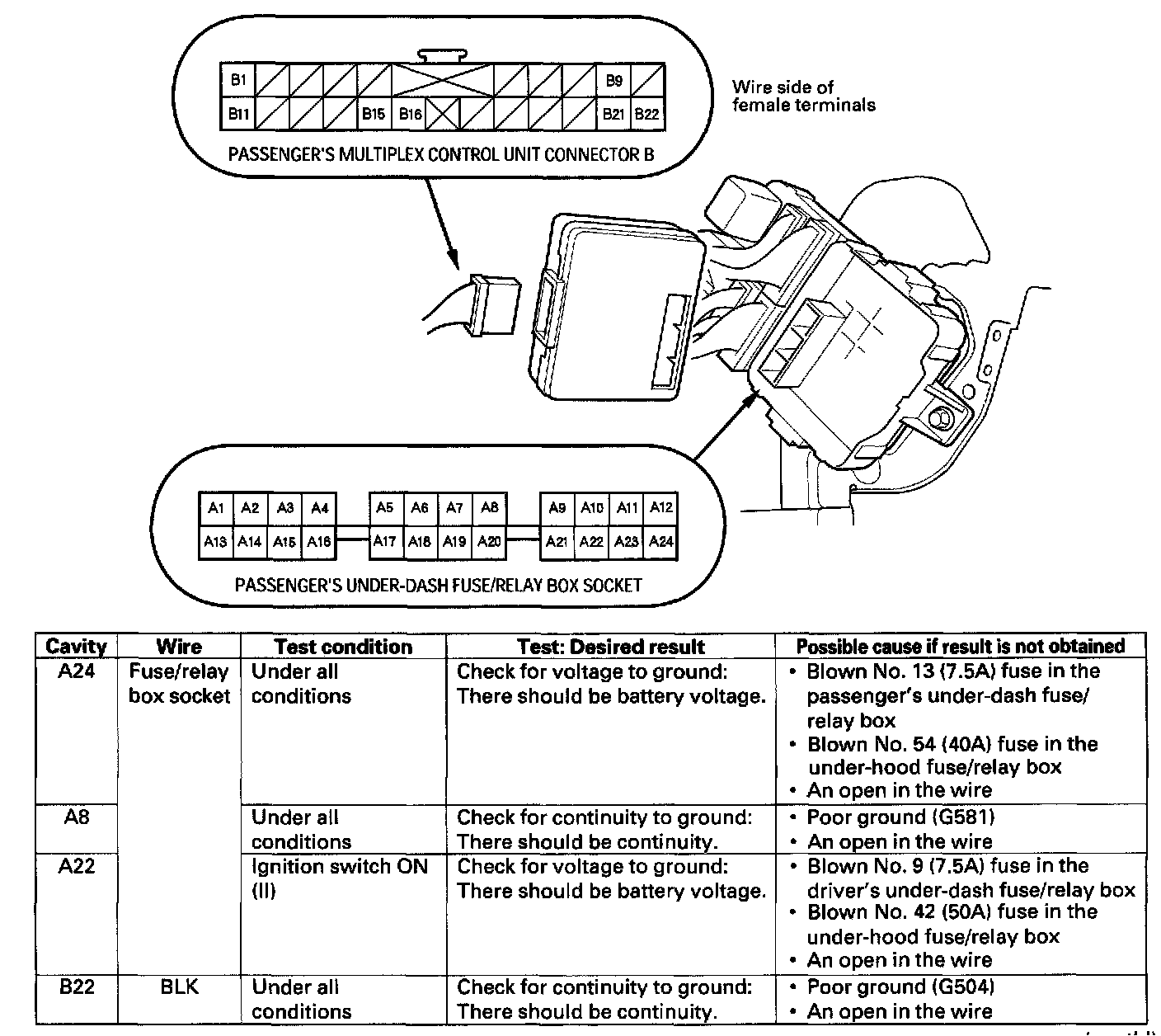 9. Make the following input tests at connector B and the fuse/relay box socket.