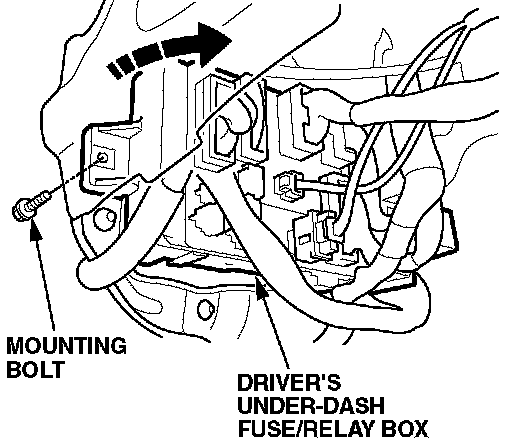 7. Remove the fuse box mounting bolt, then pull the fuse box away from the body.